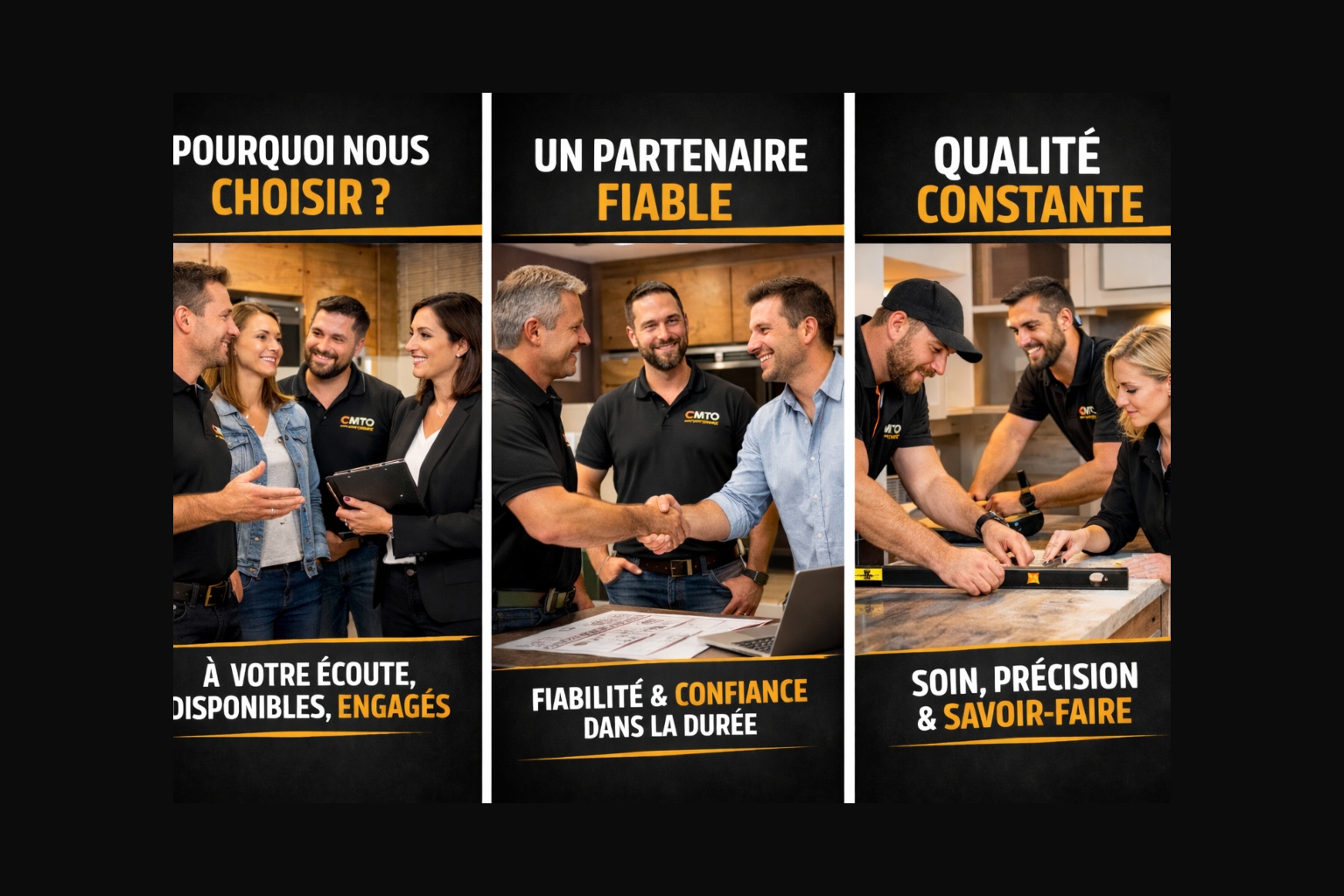 Partenaire des cuisinistes et des grandes enseignes, CMTO accompagne également les particuliers en garantissant une pose maîtrisée, des délais respectés et une qualité constante.